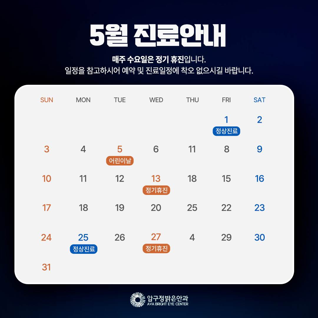 공휴일정상진료: 노동절(5/1), 부처님오신날 대체휴일(5/25)